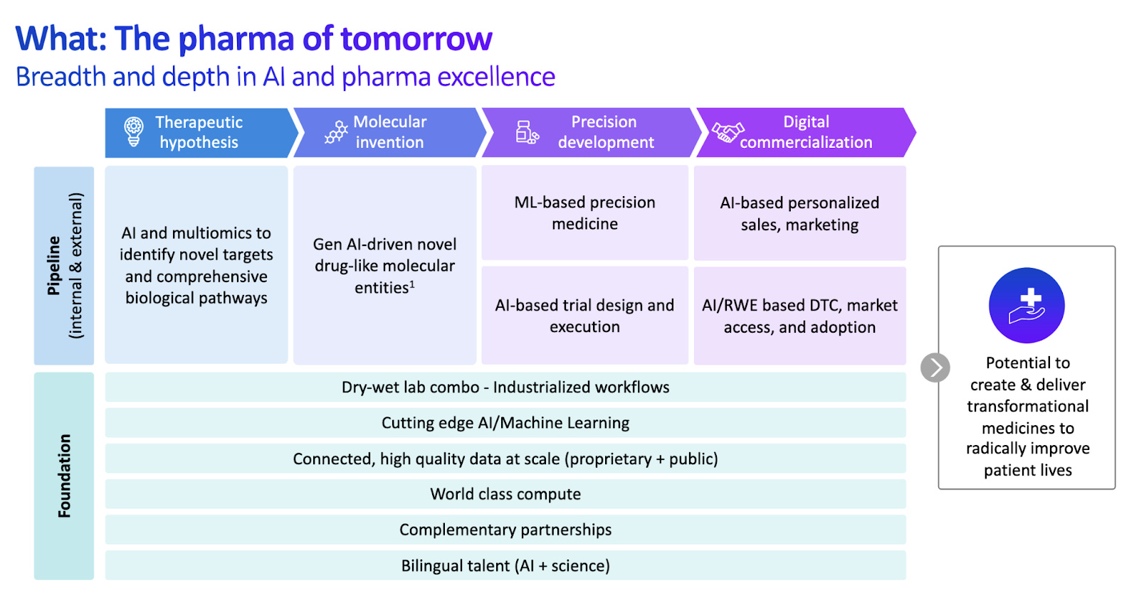 2025 is off to the races! J.P. Morgan was of course the highlight of January, connecting with likeminded investors and founders across the techbio spectrum. It’s clear we are squarely in a wave of companies built fundamentally on technology to create first and best-in-class drug products. While there have been a slew of companies integrating computation in the research and discovery phase of the biotech value chain, far and few in between integrate AI fully across the value chain, throughout development, manufacturing, and commercialization. Recursion has a bold commitment to the below, showing what a company of the future could look like. Recently funded companies like Formation Bio and Manas AI also follow in the footsteps of the AI-centric biotech beast, proudly claiming to optimize and automate end-to-end pharmaceutical drug formation.